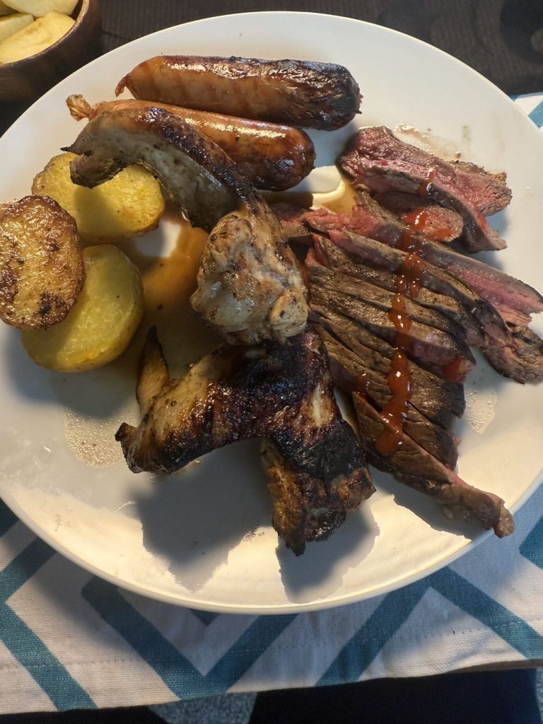 this is BBQ food and chicken wing and sausage, potato, steak, today very delicious food, I like very much yummy